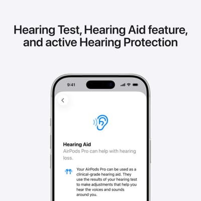 AirPods Pro 3 bring improvements to the world’s first end-to-end hearing health experience. Now you can take a scientifically validated Hearing Test in a broader range of background conditions. The Hearing Aid feature now with 67 per cent more battery life in Transparency on a single charge. And active Hearing Protection helps prevent exposure to loud environmental noise.
