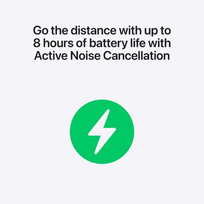 - Up to 8 hours of listening time on a single charge with Active Noise Cancellation enabled (up to 7.5 hours with Spatial Audio and Head Tracking enabled)
