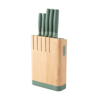 Want to jumpstart your knife collection? Then this 6 piece knife block with built-in sharpener is the way to go! This versatile set contains a hand-sharpened stainless steel paring knife, utility knife, carving knife, bread knife and chef’s knife. In the beautiful wooden knife block you can conveniently keep all these knives organized and within reach for efficient food preparation. You can even keep your knives sharp with the on top build-in knife sharpener. The knives feature an ergonomic soft-touch handle for a comfortable grip. And last but not least, extend your knife block with a matching kitchen scissors in the same Forest-green color.