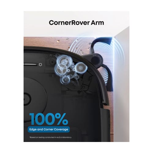 The CornerRover Arm tackles hard-to-reach areas like edges and corners. It increases overall cleaning coverage by 20%, and ensures 100% edge coverage for seamless cleaning. Note: Based on testing in eufy’s laboratory.
