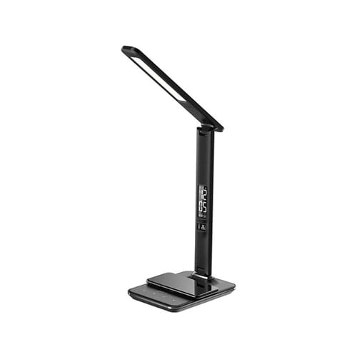 A versatile, multipurpose LED desk lamp with three different light settings, built-in 5W wireless charging pad and alarm clock function.