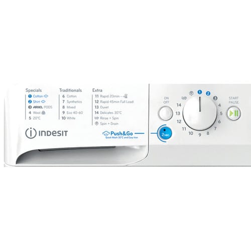 Indesit’s Push&Go technology is designed to effectively remove more than 20 common types of stains, without pre-treating, in just 45 minutes, at the push of a button.* *1 push is needed after initially switching on the appliance