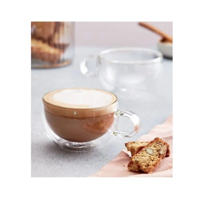 Set of 2 thermally insulated Cappuccino glasses (250ml), hand crafted and individually mouth-blown in a stylish design. Their double walled construction means drinks stay hot for longer while the exterior remains cool to the touch. Made from Borosilicate glass for superior strength and clarity, these glasses are both scratch resistant and dishwasher safe.