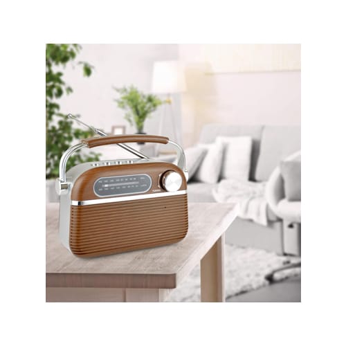 The vintage style and strong stylish carrying handle has a nostalgic feel, yet still features the modern essentials such as MP3 playback and Bluetooth connection. The wood effect and silver colouring offers a fully-functional retro decoration to add to your home.