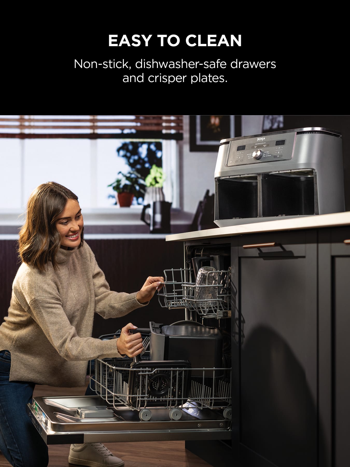 Dual Zone cooking just got a brand new look. Meet the large capacity air fryer that cooks 2 foods, 2 ways, and finishes at the same time – now with an updated design and sleek, dark grey metallic trim.