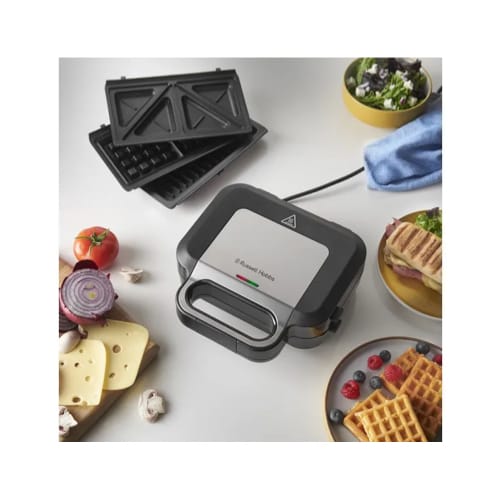 Enjoy your favourite food any time, day or night with the versatile Russell Hobbs 3-in-1 Sandwich Maker. With three interchangeable plates: deep fill sandwich, waffle and grill, you can create the perfect dish to satisfy your cravings! Why not start your day with a deep-filled breakfast sandwich, make the most of lunchtime with a delicious panini or give into your sweet tooth with a waffle. The removable plates have a 3 x more durable* advanced non-stick coating, so you can wipe them clean in just one wipe** or pop them in the dishwasher or sink. With a carry handle and clip lock action for vertical storage, the versatile 3-in-1 Sandwich Maker makes your go to food easy and convenient.