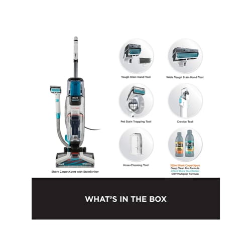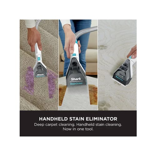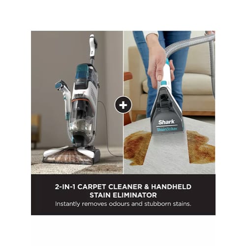 Introducing the Shark CarpetXpert Deep Carpet Cleaner with StainStriker, combining a powerful deep carpet cleaner with a built-in stain and spot cleaner for supercharged stain elimination.