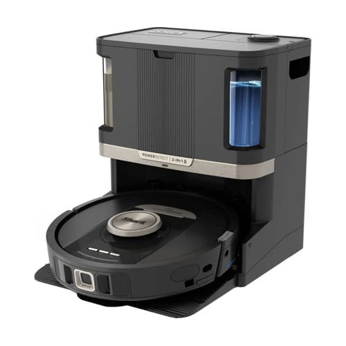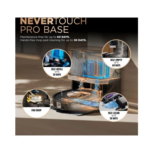 The Shark PowerDetect NeverTouch Pro 2-in-1 Robot Vacuum and Mop deep cleans all floor types with intelligent cleaning technologies, then returns to the large NeverTouch self-cleaning base to automatically empty the dirt, refill with water, and clean the mopping pad, ready for the next run. Welcome to hands-free cleaning.